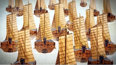 た場面から豊臣秀吉が亀甲船艦隊を導いて朝鮮を侵略する場面が出てくる。