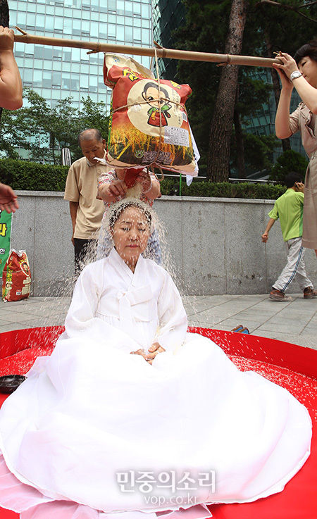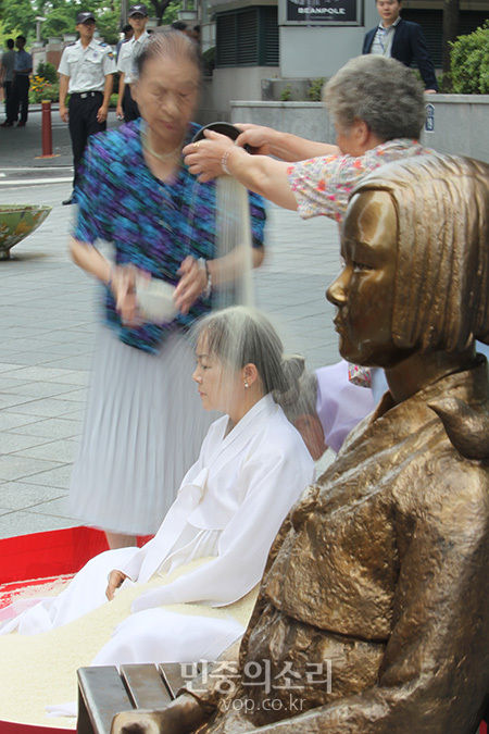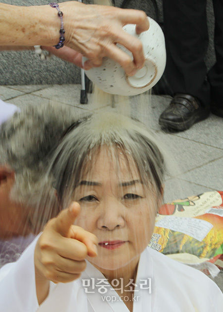 【韓国】 韓服の女性の頭上に米をふりかける~日本大使館前で「勤労挺身隊」強制動員糾弾パフォーマンス(写真)