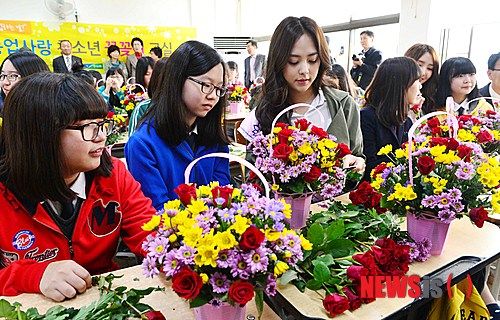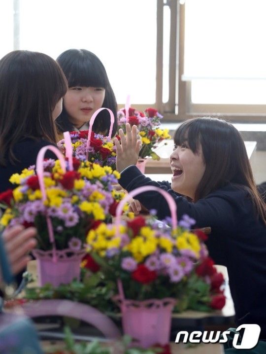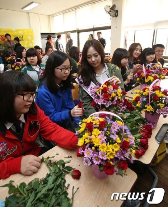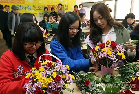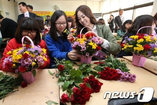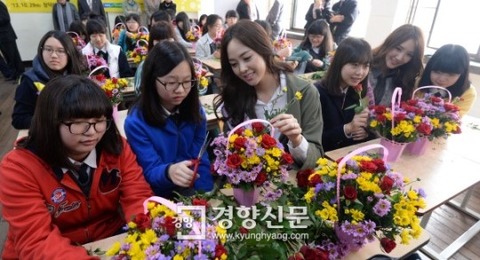 ソウル市中区の昌徳女子中学校で29日午前、生け花教室が行われ、生徒たちが