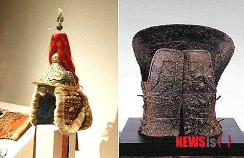 ▲写真左側から朝鮮大元帥かぶと(朝鮮王室)、伽耶鉄甲(釜山蓮山洞出土)
