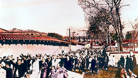 ▲慶運宮(徳寿宮)の石垣を挟んで米国領事館へ向かう3・1運動マンセーデモ隊。