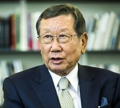 韓国が「日韓スワップ復活」を求めた日韓経済団体の会合。右から2人目は経団連の榊原定征会長=26日、東京都内