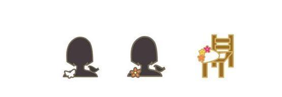 少女の顔と右肩には鳥、左肩には蝶々と花をかたどったバッジ2種類と、花束が置かれた椅子を形象化したバッジだ。