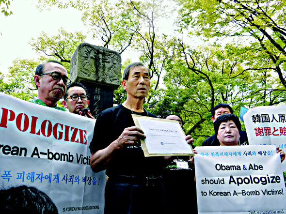 韓国人慰霊碑前で記者会見を開き、「原爆について責任を取らなければ世界の平和もない。オバマ大統領はこの碑石の前で、私たちに謝罪すべきだ」と声を高めた。