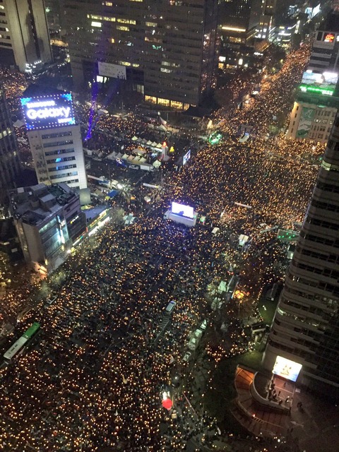 先月29日から始まった週末ろうそく集会が1か月間も続いており、26日は参加人数が全国で190万人(主催側試算)に膨らんだ。史上最大規模だったが、警察に連行された人は一人もいないほど、平和集会が続いた。これを巡って、海外では、「朴槿恵(パク・グンヘ)政権が崩壊させた国格を国民が再び築き上げている」と、絶賛する反応も出ている。