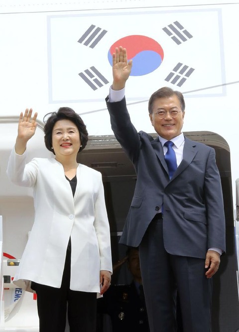 28日、訪米のためソウル空港を出発する韓国の文在寅大統領夫妻(聯合=共同)