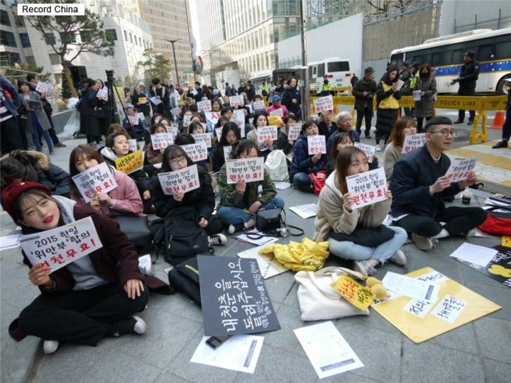 写真は慰安婦問題をめぐる日韓合意の無効などを訴える人々。