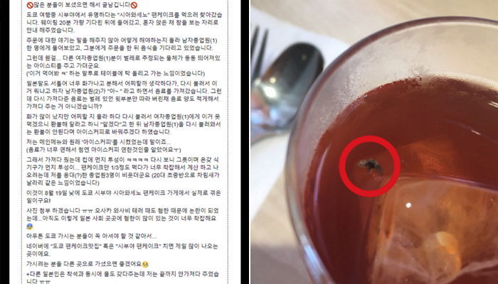 「ワサビテロ」に続き、先月には東京の有名パンケーキ専門店で韓国人観光客を相手に「ほこりテロ」、「虫テロ」が行われたと主張するネチズンも明らかになった。ネチズンB氏は「渋谷に位置するパンケーキ専門店で食べ物を注文したが、女性従業員が飲み物に虫を浮かせて持ってきた」として「従業員に抗議するとすぐに虫があった部分だけ捨ててまた持ってきた」と主張した。