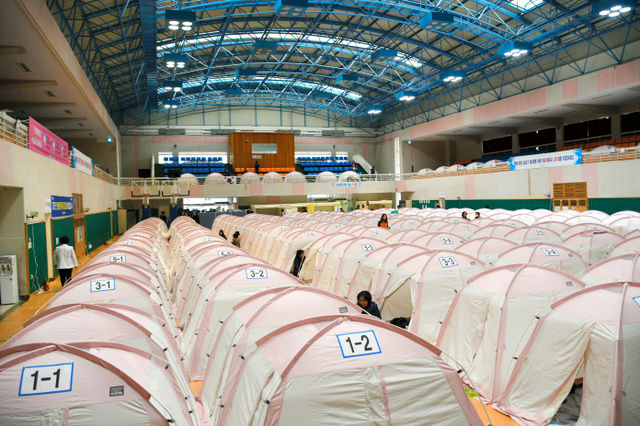 地震で自宅が損壊し、体育館に張ったテントで寝泊まりする被災者たち=22日、韓国・慶尚北道浦項市、武田肇撮影