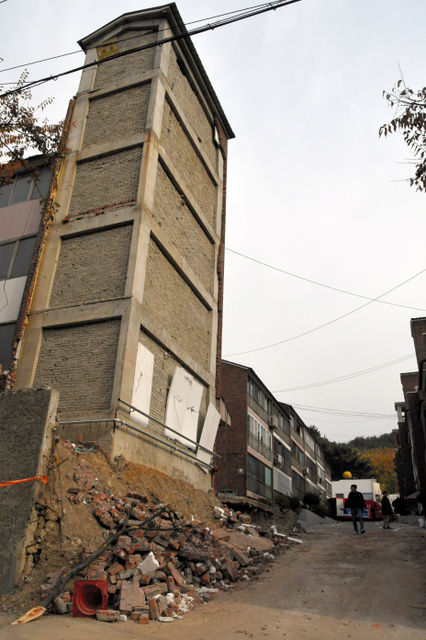 地震のため、斜めに大きく傾いたアパート。倒壊するおそれがあるとして、近づかないように周囲に警察官が配置されていた=22日、韓国・慶尚北道浦項市、武田肇撮影