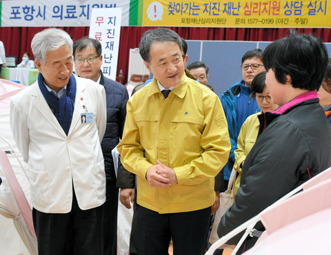 避難所を視察し、被災者から要望を聞く韓国の朴凌厚(パクヌンフ)保健福祉相(中央)=22日、韓国・慶尚北道浦項市、武田肇