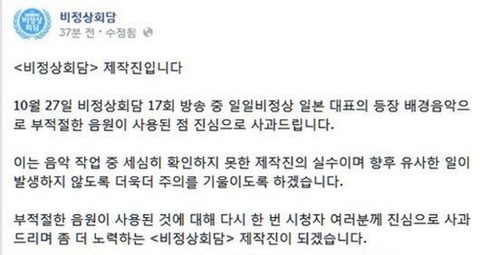 過去2014年10月27日に放送されたJTBC「非首脳会談」は、日本の俳優の武田裕光が登場するときにバックグラウンドミュージックに君が代を再生した。
