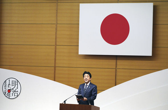 ▲安倍晋三首相が23日、東京・永田町の憲政記念館で開かれた「明治150年」記念行事に参加し演説している=東京/AP聯合ニュース