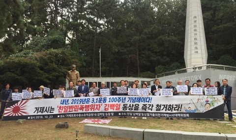 参加者は、キム・ベクイルの銅像の前に日本の『旭日旗』を地面に広げて踏んだ。対策委は、「親日銅像撤去以外に別の要求事項はない」とし、「撤去されない場合は今後論議をして、対応方法を定める」と明らかにした。