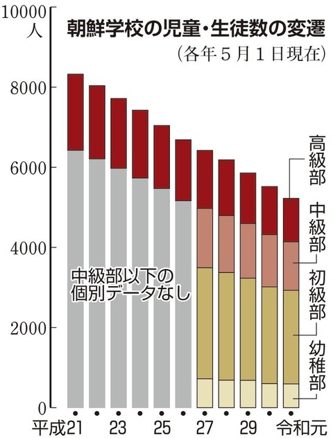 法務省の在留外国人統計によると、韓国籍と朝鮮籍を別々に公表するようになった平成27年12月に朝鮮籍の18歳以下の子供は3120人だったが、30年12月には2343人に減少。令和元年6月には、2235人まで減った。韓国籍の子供も同じ傾向がみられる。