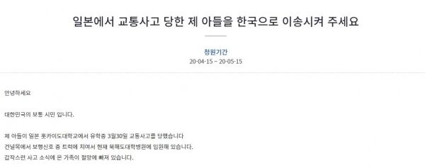 「日本で交通事故にあった私の息子を韓国に移送してください」というタイトルの請願をあげた被害青年の父親は「息子が日本の北海道大学留学中の3月30日、交通事故にあった。踏切で歩行信号中にトラックにひかれて現在、北海道大学病院に入院している」と明らかにした。