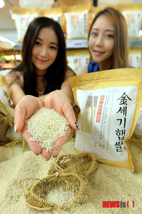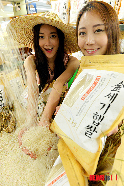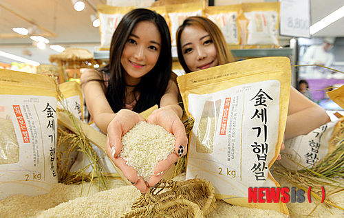 ソウル市竜山区の大手スーパー「イーマート」竜山店で30日午前、新米が店頭に並んだ。写真は、「金世紀新米」をPRするモデルたち。