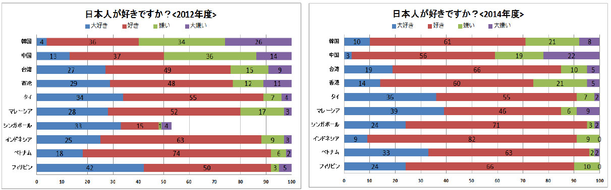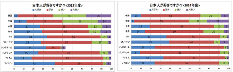 「日本人が好き(大好きを含む)」という韓国人は、2012年の調査時は40%だったが、2014年では71%となり、31ポイントも上昇。