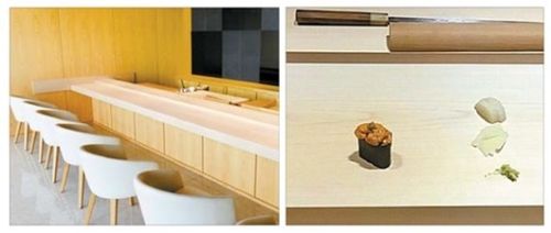 「SUSHI CHO」のカウンターは8メートルのヒノキのバーカウンターで構成されている。日本の職人が樹齢350年のヒノキを15年間自然乾燥させて作ったものだ。日本各地から空輸してきた皿や箸などと相まり、一幅の絵のような食空間を演出している。
