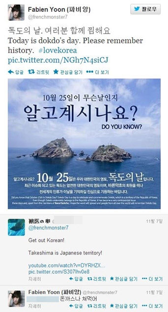 フランス出身のタレント『ファビアン』は2014年10月25日、自分のTwitterに独島の写真と一緒に、