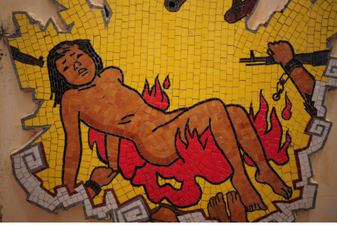 ベトナム中南部ビンディン省タイソン県タイビン寺に立てた「ビンアン虐殺事件」(1966年)追悼碑のモザイク画。ベトナム戦当時の韓国軍による虐殺場面を描写している=ク・スジョン氏提供