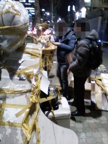 この男性たちは、今年1月から少女像の周りに、このような宣伝物とゴミを付けて、これをはずす少女像を守る会員・市民と葛藤をもたらしてきた。