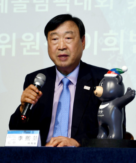 平昌五輪まで半年を前に記者会見する李熙範・大会組織委員長。「北朝鮮が参加すると信じて準備している」と語った=1日、韓国江原道・平昌
