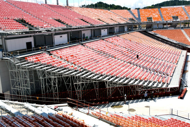 建設中の平昌五輪の開閉会式会場。1日の時点で完工率は87%。大会後は野外公演場などとして使用され、仮設の観客席はすべて撤去される=1日、韓国江原道・平昌