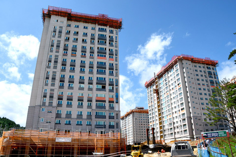 建設中の15階建ての選手村。五輪期間中は約3600人の選手らが宿泊する。五輪後はリゾートマンションになるが、すべて契約済みという=1日、韓国江原道・平昌